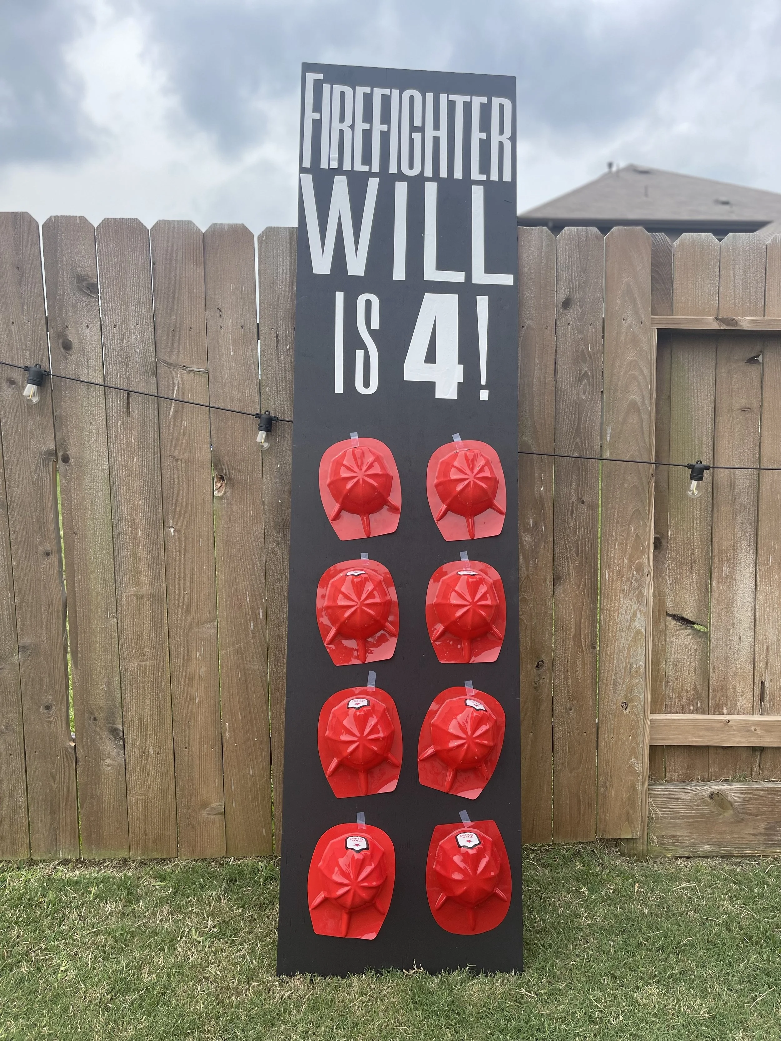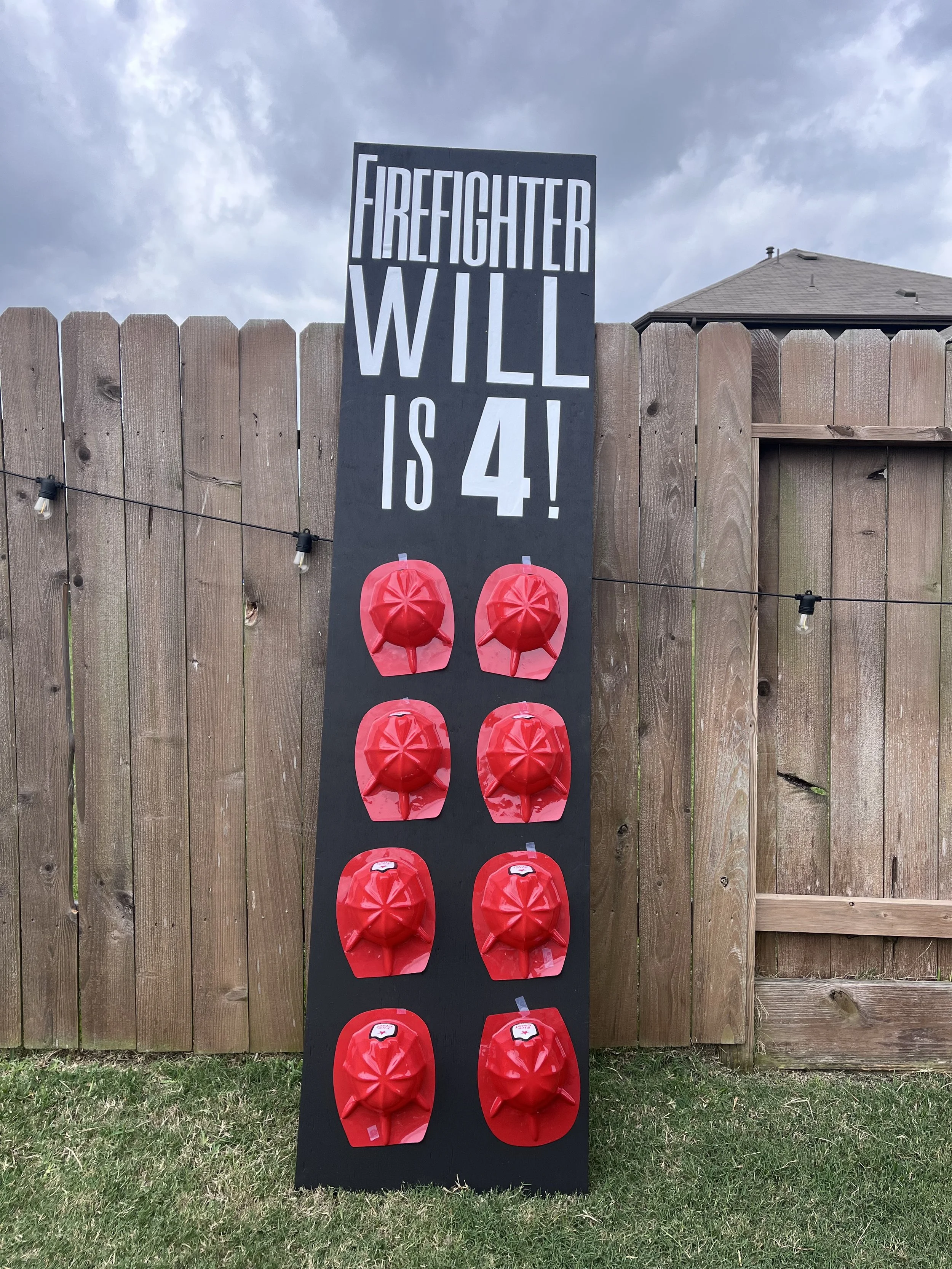 If you're planning a firefighter-themed birthday party, this DIY sign is a perfect addition! Not only is it a fun way to display fire helmets for party guests, but it also makes a great photo backdrop. You can build it using half of a standard 4x8’ plywood sheet (left over from our DIY burning building game), or make a wider version using the full sheet. This project is beginner-friendly and totally customizable—even without fancy tools.